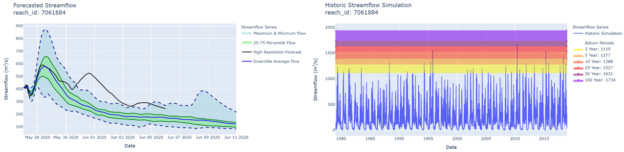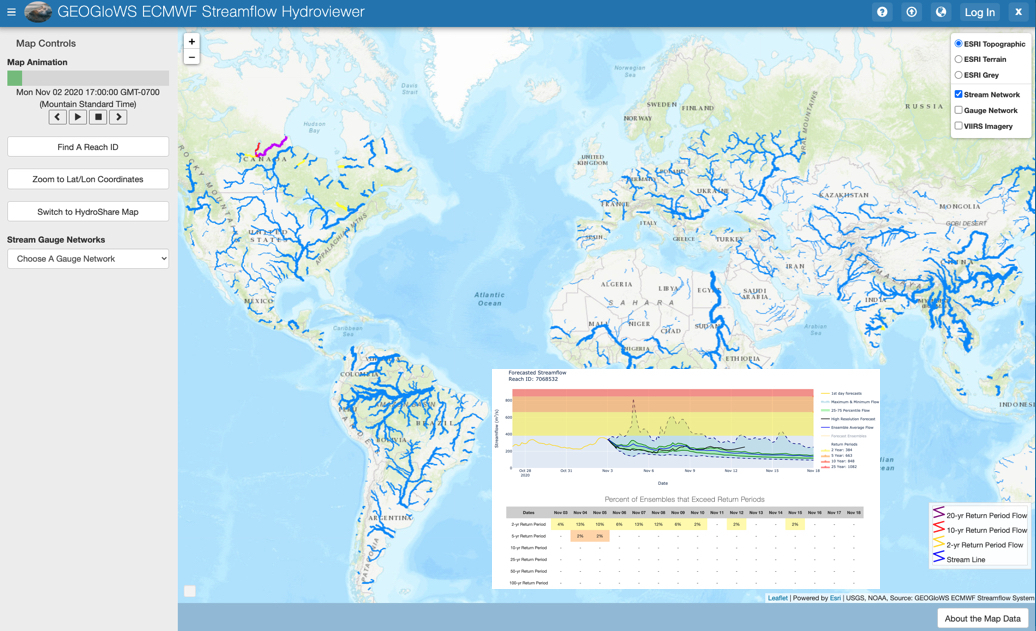 The streamflow services are powered by the cyberinfrastructure at ECMWF by using their ensemble meteorological forecast through the HTESSEL land surface model to produce global runoff on a 16x16 kilometer grid. This output is further mapped to the GEOGLOWS watersheds and routed through the river network using the RAPID model to produce a 15-day forecast on every river. The ERA-5 retrospective historical data are run over the same domain to produce the 40-year record of streamflow that is used to derive return-periods and put the current forecast in context (See Publications for technical descriptions of the different workflow processes).