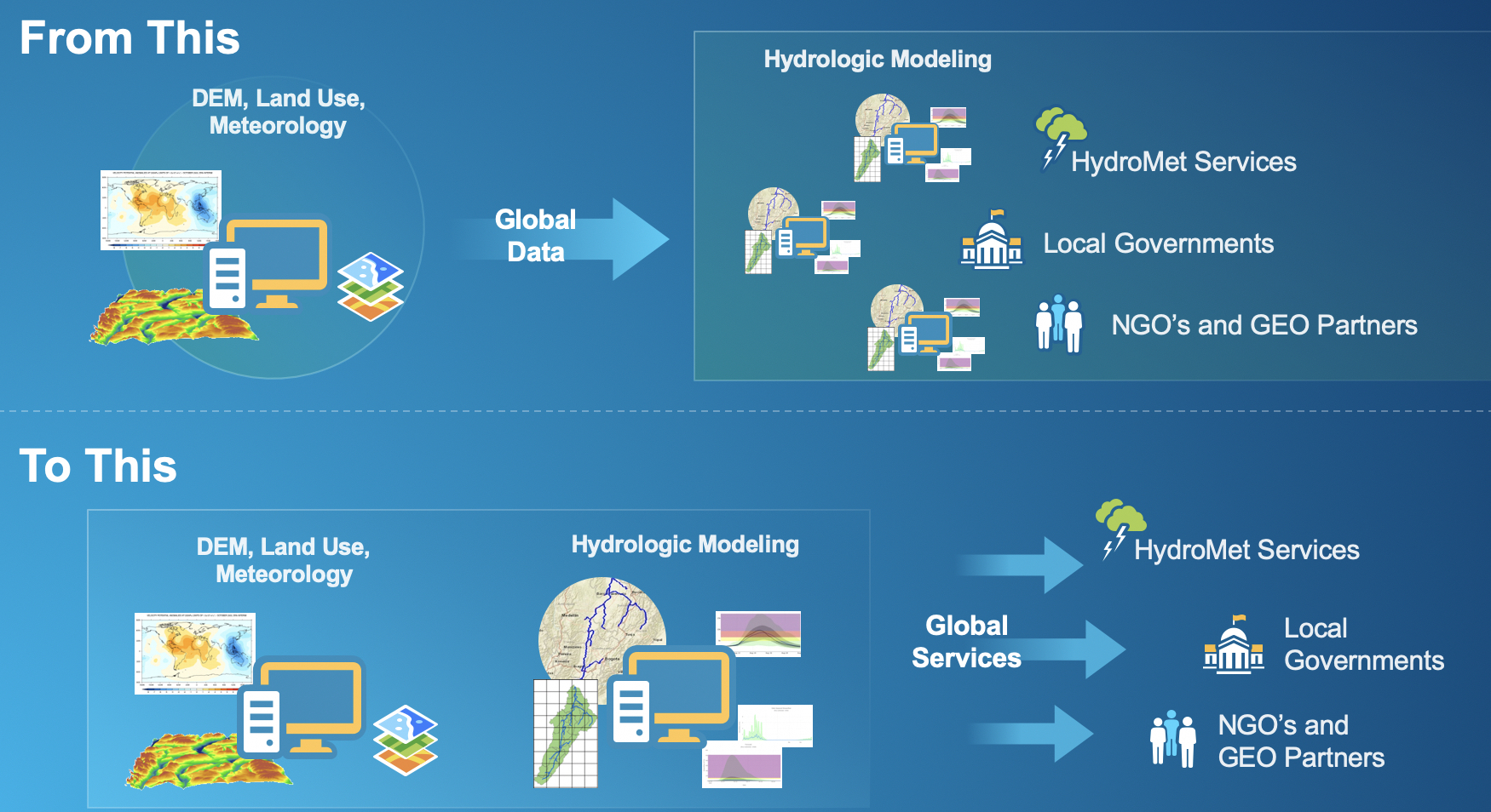 In the past, millions of dollars have been invested by international and local agencies to develop hydrologic models from global data sources. This approach requires every agency to be able to download input data (e.g., terrain information, land use, meteorological, and other) to create models, and then have the computational power, software, and human capacity necessary to run and calibrate them. Having to replicate this resource everywhere is expensive in terms of the cyberinfrastructure required but perhaps more costly are the unrealized benefits as such systems often frequently have short useful life spans because of the costs to maintain and operate them.